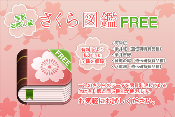 より多くの皆様に「さくら図鑑」をお楽しみ頂けるきっかけになればと、2014年2月11日に無料版(機能制限版)アプリ「さくら図鑑FREE」を公開致しました。