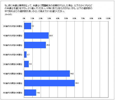 弁護士に依頼するなら年代・性別で、どのタイプの弁護士に依頼するか。という質問でもっとも多かったのは「50歳代の男性の弁護士」60.3%、次いで「40歳代の男性の弁護士」54.2%という結果になりました。3位以下は20%以上離れ、「40歳代の女性の弁護士」29.0%、「50歳代の女性の弁護士」25.8%となりました。