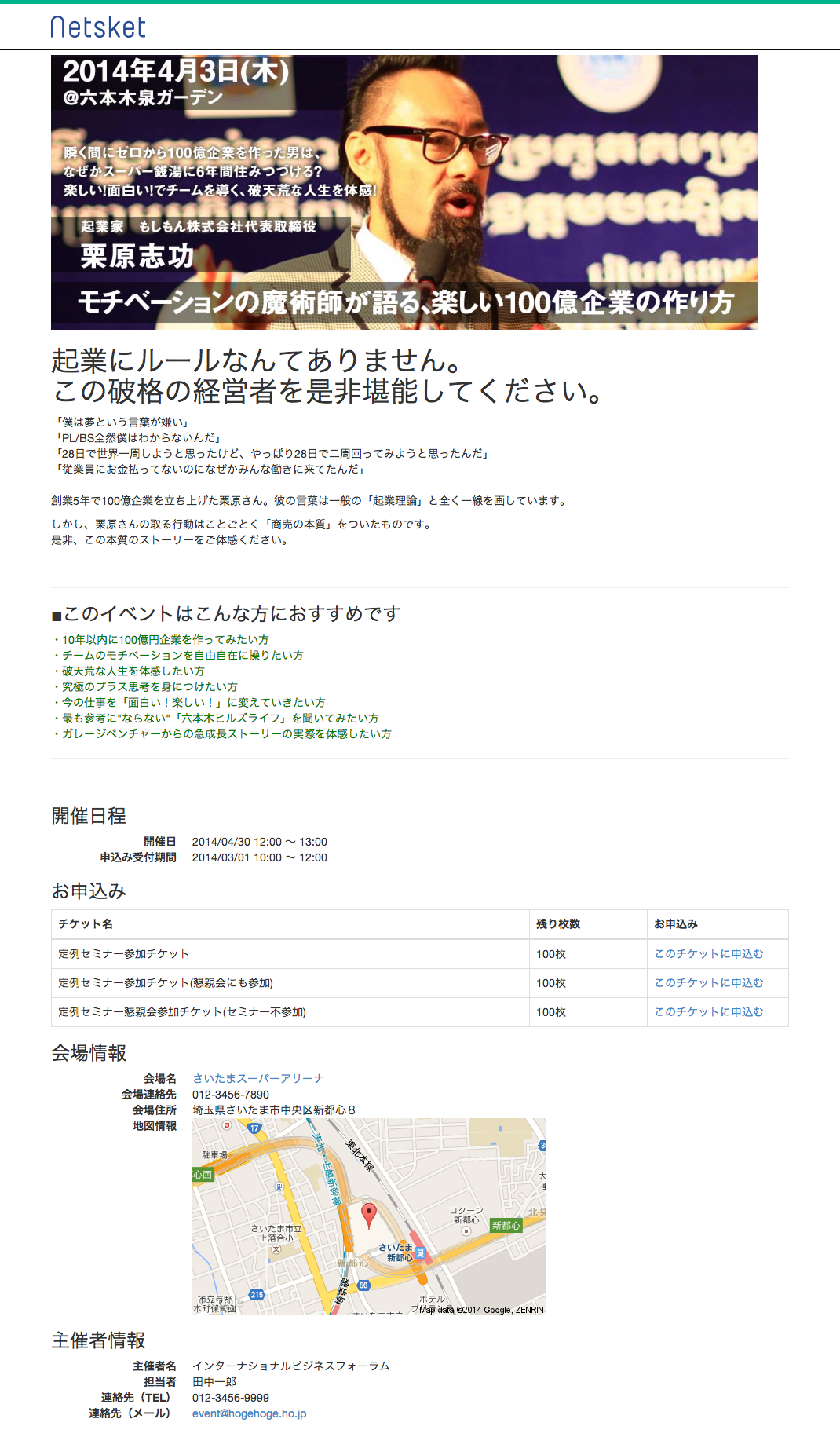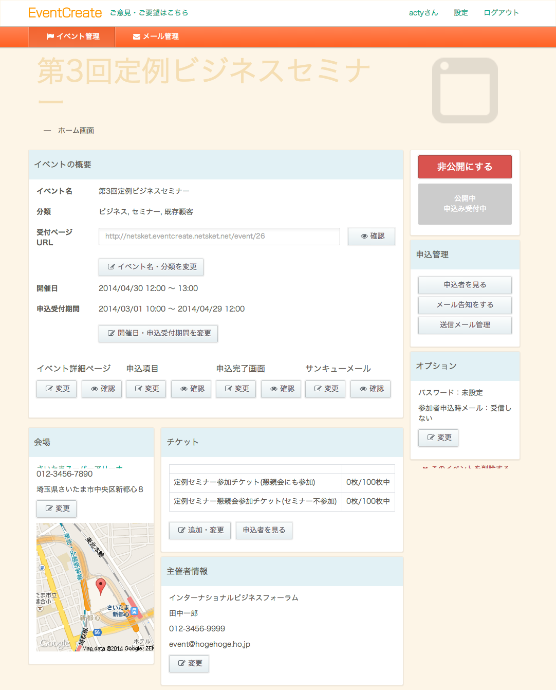 株式会社ネットスケット(所在地:埼玉県上尾市、代表取締役:芥川武)は、イベント管理ASP『EventCreate(イベントクリエイト)』を2014年4月14日(金)より提供開始いたします。