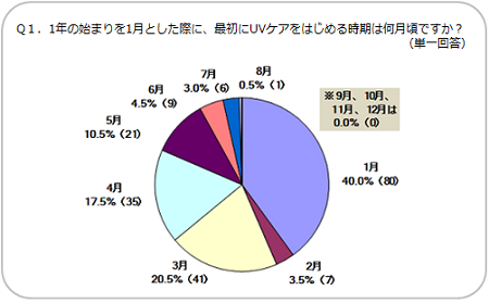 気になるUVケアの開始時期については、最初にUVケアをはじめる月を聞いたところ、4割が「1月」と回答。季節を問わず、年間通してUVケアをしている女性が多いようです。1月~3月を合わせると全体の64.0%にものぼり、女性の多くが春先までにUVケアをはじめていることもわかりました。