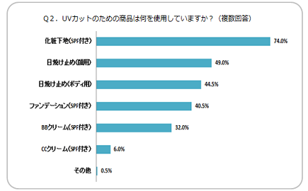 UVカットアイテムとしては、圧倒的多数の74.0%がSPF付きの「化粧下地」を使用。「顔用日焼け止め」もほぼ半数の49.0%が使用しています。「ファンデーション」は40.5% が、「BBクリーム」「CCクリーム」は合わせて38.0%が使用。UVカット効果のあるアイテムの、顔への複数使いが主流になっています。また、「ボディ用日焼け止め」は4割を超える44.5%が使用していました。