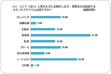 UVケアを行うために追加・変更するスキンケアアイテムは、1位が「美容液」(37.9%)、2位が「シートマスク」(29.3%)と、スペシャルケアアイテムが2トップを占めました。スキンケアアイテムによるUVケアは、美白効果の高いスペシャルケアアイテムに頼る傾向がうかがえます。次いで、「クレンジング」「クリーム」(ともに19.0%)、「化粧水」「乳液」(ともに15.5%)などの基本ケアアイテムが続いています。