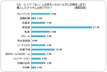 今年に入ってから購入したUVケアアイテムは 、購入者の約3人に1人にあたる31.7%が「美容液」と回答。ここでも、UVケア効果の高い「美容液」への信頼の高さがうかがえます。2位はUVカットアイテムである「化粧下地」(12.2%)、3位に基礎スキンケアの「クレンジング」「乳液」(ともに9.8%)が続いています。