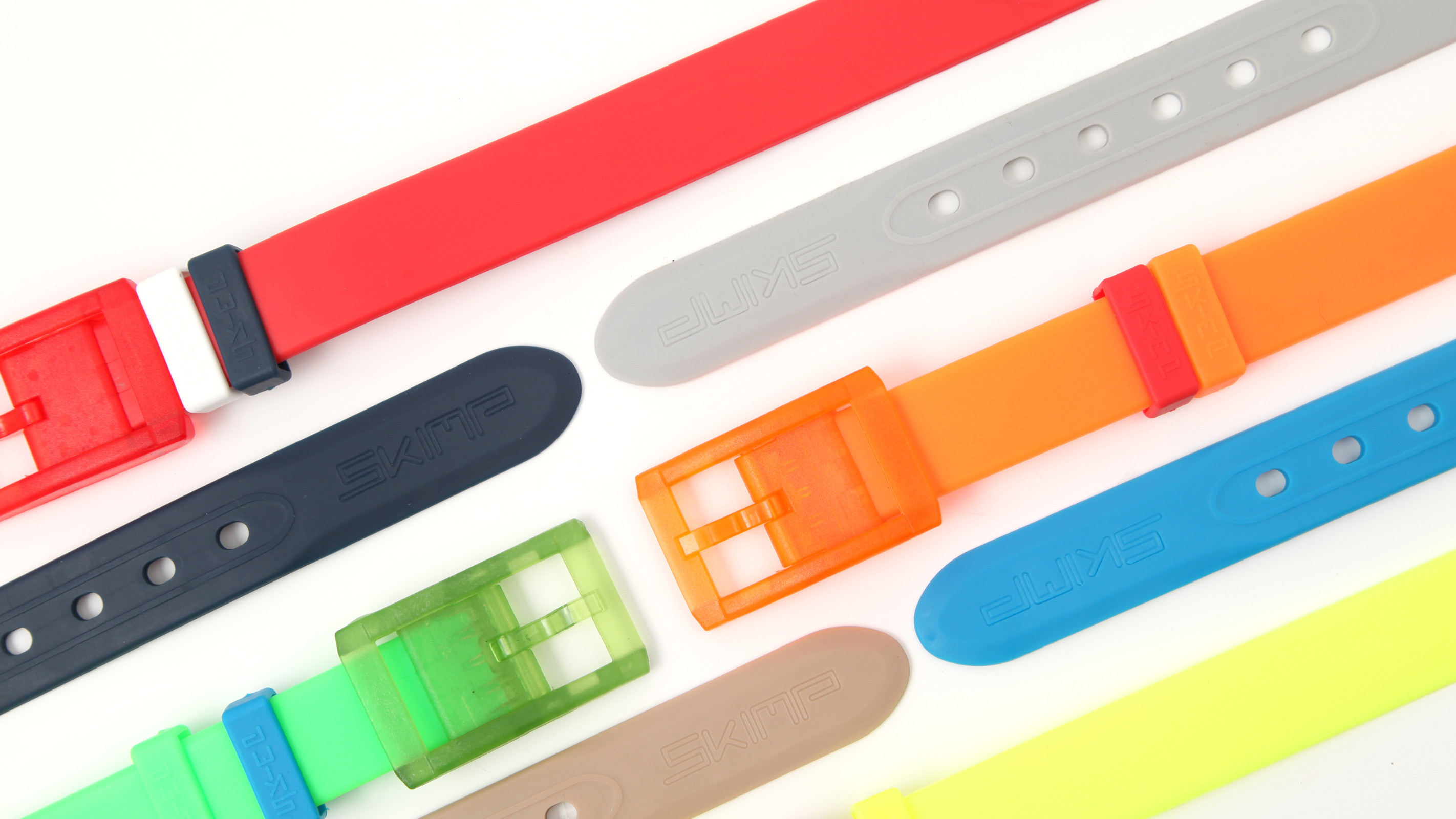 「SKIMP」初の商品化されたラバーベルトで、クリアハードケース入、オリジナルマーカー入と2種類あります。商品開発のきっかけは、日本への旅行の際、空港での不快なセキリュティーチェック時にフランス人デザイナーは思いつきました。金属を使用しない、ネオンカラーを基調とした、明るいカラーが特徴です。ラバーべルトである為、丈夫で天候も気にせず使用可能です。フランス国内では、馬術、乗馬の際に使用されています。