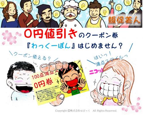 店舗販促のサポート業を営む株式会社はぴっく(横浜市 代表取締役 眞喜屋実行)が運営する販促ツールショップ「販促美人」は、「スマイル0円券」など、値引きしないクーポン券『わっくーぽん』を2014年4月7日(月)に販売開始致しました。