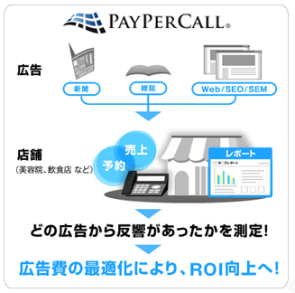 ペイパーコールは、各種広告からの電話による問い合わせの件数(反響)を、各々に割り振った電話番号から測定することができるクラウド型のサービスです。ペイパーコールの測定結果をもとに、効果のあるメディアに出稿を最適化し、ROIを向上させることが可能となります。