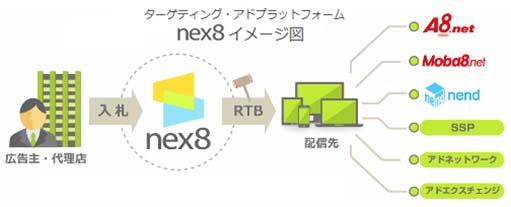 株式会社ファンコミュニケーションズ(東京都渋谷区、代表取締役社長 柳澤安慶 東京証券取引所市場第一部:2461)は、4月8日、新サービス「nex8」のβ版(※1)をリリースいたしました。「nex8」はF@Nグループが運営する国内最大級の広告ネットワークA8・moba8・nendや国内の代表的なAdExchange・SSPへ配信ができる(※2)、“ターゲティング・アドプラットフォーム”です。