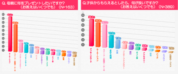 子供側に「自分の母親に何をプレゼントしたいですか?」という質問をしたところ、「1位・カーネション」「2位・スイーツ」「3位・プリザーブドフラワー」という結果となりました。しかし、お母さんたちに「子供からもらえるとしたら、何が良いですか?」と質問をしたところ、なんと1位は「メッセージカード」という結果となりました。 またコメントで「子供からのサプライズプレゼントに感動した」という意見も複数寄せられていることから、2位以下の「カーネーション」や「スイーツ」と、セットでプレゼントするとサプライズ感があって喜ばれそうです。