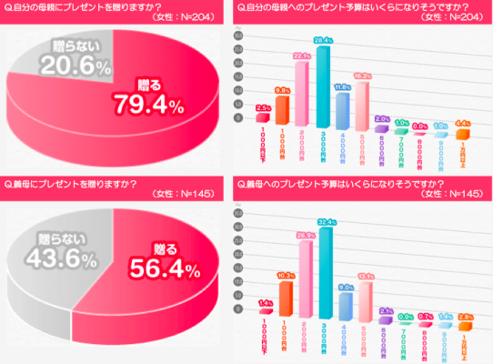 「プレゼントを贈りますか?」という質問には「自分の母親に贈る」が79.4%と、約8割が“YES”と回答。一方、「義母にプレゼントを贈りますか?」という問いには、「贈る」が56.4%と、半数ちょっという寂しい結果となりました。 しかし、義理のお母さんからのコメントで「息子のお嫁さんから毎年花が贈られてうれしい」や「お嫁さんからかわいいプレゼントが届くようになり、化粧ポーチなど女の子ならではの心遣いに感謝でいっぱい」など、お嫁さんからのプレゼントを喜ぶ声も多数ありました。義理のお母さんへのプレゼントは距離を縮めるチャンスのようです。