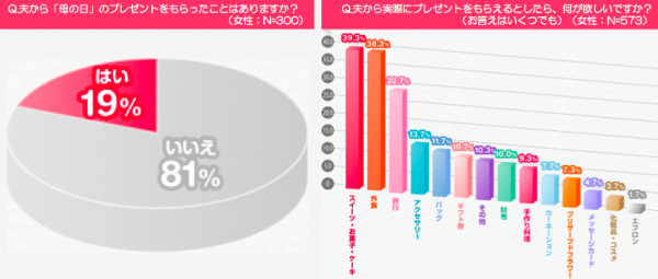 奥さんに「夫から『母の日』のプレゼントをもらったことがありますか?」と質問したところ「はい」は19.0%、「いいえ」は81.0%と、約8割の奥さんは、母の日に何ももらっていないという結果が出ました。