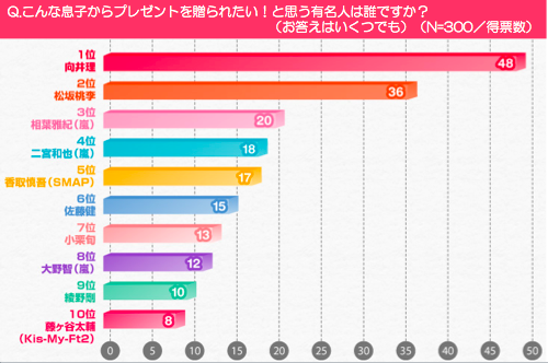 お母さんたちが選んだ“こんな息子からプレゼントをもらいたい”有名人の第1位は向井理が48票、2位には松坂桃李36票と、2014年も引き続き「塩系男子」の代表格が不動の人気を誇っています。そして、3位は相葉雅紀(嵐)20票という結果となりました。向井理は5月10日(土)公開予定の「百瀬、こっちを向いて。」に出演、4位の二宮和也(嵐)は春のドラマ「弱くても 勝てます」の主演です。いまノリに乗っている面々が「お母さん人気」を獲得する結果となりました。