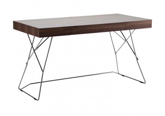 「マエストラーレ デスク」は、無駄のない直線的な量感があり、スチールのロッドフレーム上に厚みのあるウォールナット材のフラットな天板「Canaletto(カナレット)」が載る構造です。天板はウォールナットの合板もしくは希少なピグメントカウハイドで、引き出しを備えています。脚はクロームメッキのスチール、またはニッケルメッキのグロッシーブラックです。このテーブルのデザインについてルドヴィカ+ロベルト・パロンバは「異素材使いと高度な加工技術は、ザノッタとマセラティがともに蓄積してきたノウハウの賜物です」と語っています。