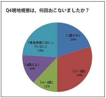 続いて前の質問で最も回答数を集めた「現地視察」について、次の2問でさらに詳しく聞いてみました。まず、どの位の回数、視察をおこなったのか?について聞いたところ、全体の半数以上にあたる56%の企業が2回以上の視察に訪れていました。そして、視察を行った企業の視察回数の平均は「3.4回」となりました。また、6回以上視察行った企業が全体の14%もおり、かなり多く現地視察を行っていることがわかりました。