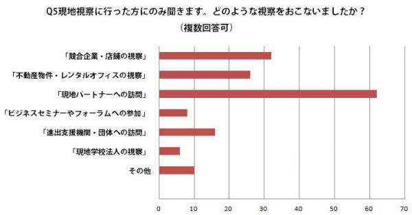 最も多かったのは「現地パートナーへの訪問(62%)」となり、続いて競合企業(店舗)などの調査(32%)、不動産物件やレンタルオフィスの訪問(26%)の項目が順に並ぶ結果になりました。