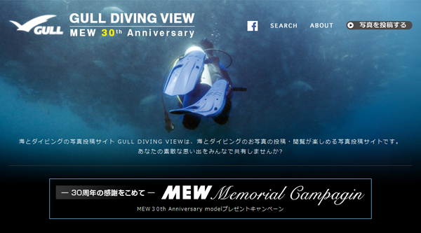 本サイトでは、GULLの人気商品ダイビング・ドルフィンスイム・スキンダイビングなど多くのダイバーに愛用され続けてきた、伝統が生む最高品質 のラバーフィン「MEW」の30周年を記念したキャンペーンを実施中です。