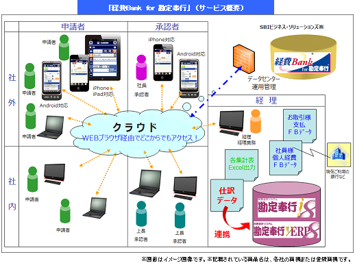 昨今、ビジネスシーンでのスマートフォンやタブレット端末の利用が急速に普及しております。その環境を有効的に活用し、改善効果が期待される業務として、旅費・交通費などの経費精算業務が注目されている一方、表計算ソフトや紙の申請書などで経費精算を行っている中小企業も多いようです。経費精算は申請者、承認者、経理担当者など多くの社員が関わり、申請内容の確認・承認・仕訳計上・支払といった処理に手間と時間がかかり、多くの業務コストを発生させています。当社とOBCは、中小企業の経費精算業務のコスト削減を実現するために、勘定奉行専用のクラウド型旅費交通費・経費精算システム「経費Bank for 勘定奉行」を提供します。