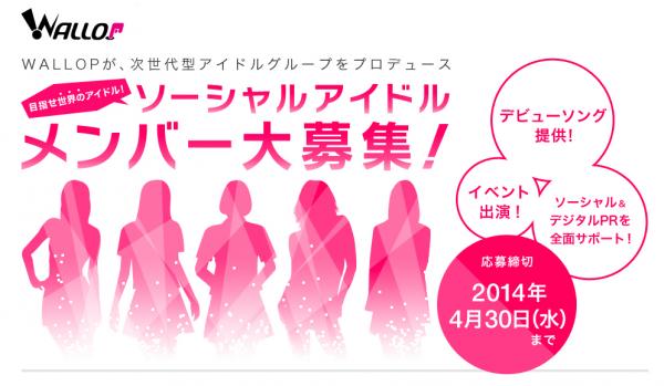 ワロップ放送局は、次世代型ソーシャルアイドルグループのプロデュースに先立ち、2014年4月10日よりグループメンバーを募集する「ソーシャルアイドルオーディション」を開催いたします。募集期間は、4月10日~30日。専用のWebサイト及び郵送にてご応募いただけます。