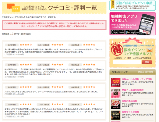 今回のリニューアルでは公開口コミ数300件以上(http://myfurisode.com/report/list)の振袖ショップに対しての口コミや評判のレーティングを活用し「振袖イベント・催事・フェア情報」 (http://myfurisode.com/event/list)