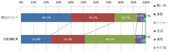 次に現在クルマを所有しており自動運転車を購入したい回答者に、現在のクルマと自動運転車の利用目的について
