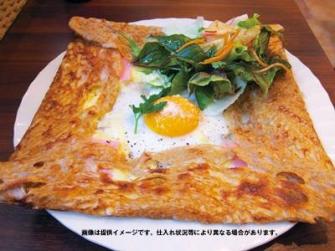「蕎麦ガレット」は、フランスのブルターニュ地方で生まれた郷土料理です。そば粉・水・塩などを混ぜて寝かせた生地を使用します。通常の甘いクレープと異なりハムとソーセージとツナを中身に入れ温泉卵&バジルを添えて提供します。当店ならではの美味しさに仕上がりました。
