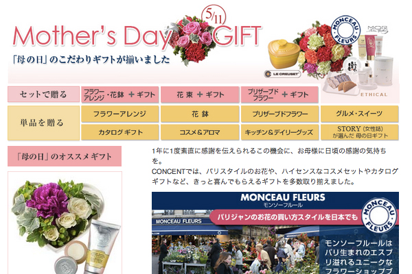 コンセント株式会社(以下コンセント、所在地:東京都港区 代表取締役:小松 廣之)は、パリのフラワーブランド「MONCEAU FLEURS(モンソーフルール)」のフラワーアレンジとスイーツやコスメのセットを中心に取り揃えた「母の日特集」を4月10日に開始しました。また、近年人気のアーティフィシャルフラワーとプリザーブドフラワーのギフトセットも充実させています。