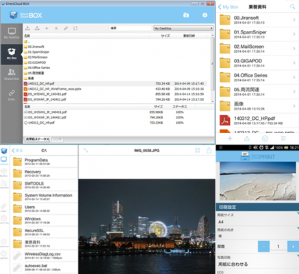 『DirectCloud-BOX』は「PCがクラウドへ参加することで、いつでもどこでもスマートデバイスからPC上のデータにアクセス!」というコンセプトで開発されたファイル共有サービスです。モバイルデバイスから自分のPC上のデータに簡単にアクセスができるので、場所にとらわれず、いつでもどこからでも必要なデータを探すことができます。リンク機能を利用すると、PC上のファイルをメールに添付をしなくても、サイズの大きなデータのやり取りが可能です。
