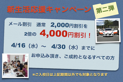 『合宿免許タッチドライブ』は、電話不要でスマートフォンからのみの申込みで合宿免許の予約を完結出来るサービスです。そのタッチドライブで期間中にお申込み頂き、ご成約となった方に、「新生活応援キャンペーン」と題して、通常2,000円を割引く“メール割引”を、4,000円の割引と致します。