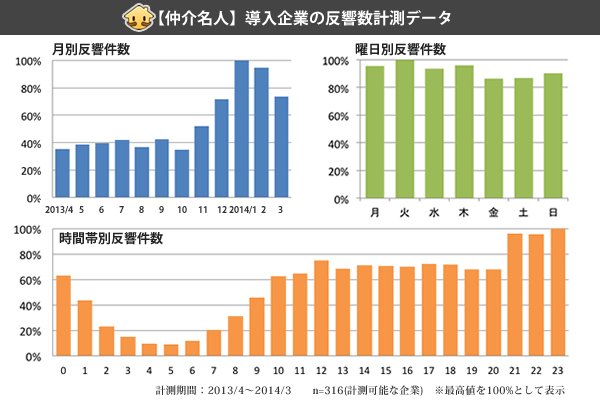 株式会社ショーケース・ティービーは【仲介名人】を導入している企業うち計測可能な316社を対象に、2013/4~2014/3の期間、反響数の調査を実施しました。調査データを月別、曜日別、時間帯別に表示したところ、ユーザ行動に特徴的傾向があらわれました。不動産会社は、ユーザ行動の傾向を把握することで今後の施策のヒントになると思われます。