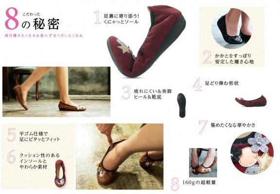 “くにゃりと曲がる、軽やか美パンプス「くにゃっプス(R)」”は、らくちんも、かわいらしさもどちらも大事にしたい乙女ゴコロに応える、歩きやすさと美脚にこだわった8つの秘密を持つ、屈曲ソールが自慢のフェリシモの登録商標のパンプスです。