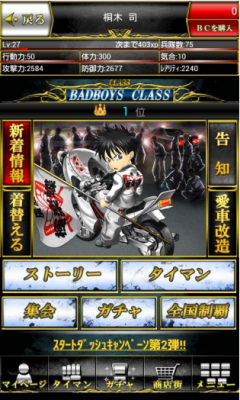本作は、累計5,000万部以上の発行部数を誇る田中宏氏作の超人気コミック「BADBOYS」を題材としたソーシャルゲームです。プレーヤーは暴走族の総長となり、原作ストーリーに沿ったミッションをこなして仲間を増やしながら、3000種類以上の単車・車の改造や、アバターを強化したりして、バトルをこなし、最強のチームを目指していくゲームです。