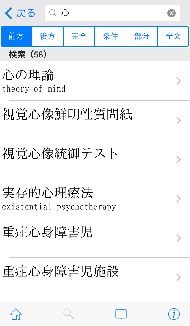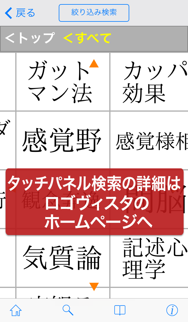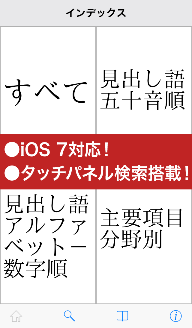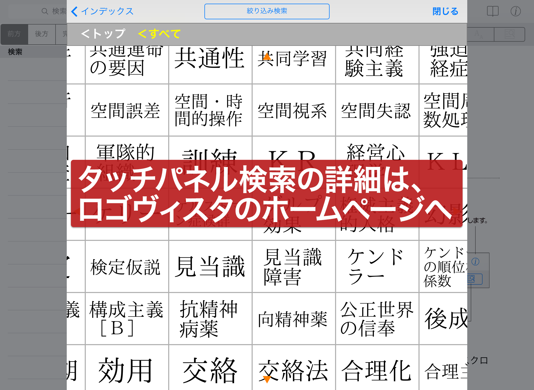 LogoVista電子辞典で培った検索方法を継承。前方一致/後方一致/完全一致/全文検索といった豊富な検索オプションを利用できます。また文字を入力すると候補見出し語が表示され、うろ覚えでも検索できるインクリメンタルサーチや、検索結果に表示された本文中の用語をなぞることでそのまま連続辞書引きも可能。思考を妨げることなく次々と検索できるのが特長です。マルチタッチによる拡大やセンサーによる画面の回転にも対応しています。