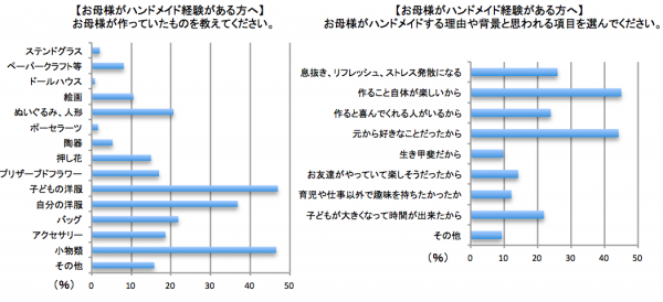 また「お母さんがハンドメイドする理由」を質問したところ「作ること自体が楽しいから」(45%)、「元から好きなことだったから」(44%)がダントツで多い結果となり、暇つぶし等といった目的というより、ハンドメイドすること自体を楽しむお母さんが多くいらっしゃることが想像できます。