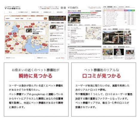 当社が開設したペット葬儀マップ(http://www.pet-farewell.net/)は、あなたのお住いの近くにあるペット葬儀社をマップから検索し、提供されているサービスや口コミからお亡くなりになったペットに合った葬儀社を見つけられる唯一のサイトなのです。