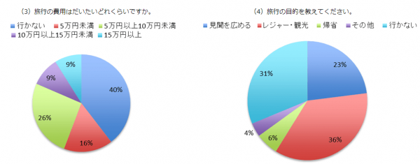 全体の36%にあたる「レジャー・観光」そして「行かない」に次いで多いのが、「見聞を広める」という結果になりました。どうせ旅行に出かけるなら、単に遊ぶだけでなく、知識が増え、経験から学べるものにしようというご家庭が多いようです。