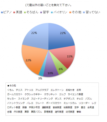 多かったのは「集中力をつける」「自信をつける」でした。また「気分転換」「リフレッシュ」を除くと多かったのは、そろばんやくもんなどでは「計算力がつく」、ピアノなど楽器関係では「音感がつく」英語など外国語は「ヒアリングができるように」スポーツ、武道系では「チームワーク、精神力、粘り強さ」といった効果を狙っているという回答です。