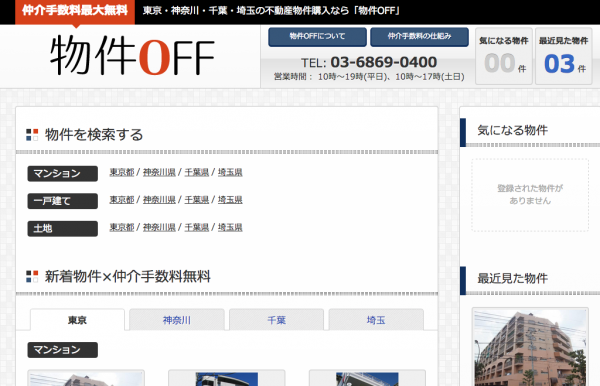 1.都内に特化した仲介手数料最大無料の住宅物件情報を簡単検索! 物件OFFの最大の特徴は仲介手数料最大無料!「東京・神奈川・千葉・埼玉」4都県の「マンション・戸建て・土地」の住宅物件情報を掲載している、都内に特化した住宅物件情報サイトです。お手数となる会員登録などのは不要ですので、お気軽に物件を検索していただけます。