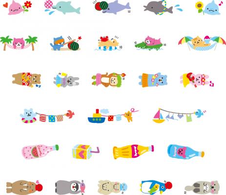 ペンギンやアザラシ、セイウチなど海の生き物たちが大集合した「シーアニマル」や、ウクレレを弾いたり踊っている動物がかわいい「フラダンス」、縦使いのカラフルでポップな「ドリンク」など、カードに使ったり、スケジュール帳の夏のイベントを飾るのにぴったりな全6柄のラインアップです。好評の「おまけ柄」は、スイカを割る「イルカ」や、サングラス焼けしたネコがいる「ビーチ」など、探す楽しさ満載♪