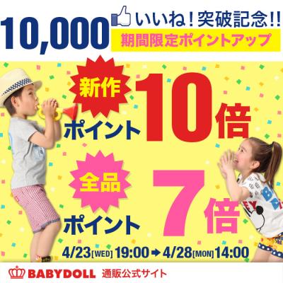 株式会社コージィコーポレーションが運営するベビー・キッズ服ブランドBABYDOLL(ベビードール)が、[通販Facebookページ10,000いいね!達成記念キャンペーン]を通販公式サイトにて開催します。4/23(水)19:00~4/28(月)14:00の期間に通販公式サイトで商品を購入すると新作ポイント10倍、その他全品ポイント7倍となります!