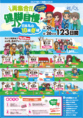 この『再集合!! 健脚自慢~日本名山10選“登破”』は、延べ参加人数8,825名と昨年好評を博した健康イベント「ゴルフDE東海道53次ウォーク」に続くゴルフリソルカード会員(登録料無料)向けのキャンペーン企画で、気軽に参加してゴルフとウォーキングを楽しみ、かつグループゴルフ場の支払いなどにも使えるリソルカードポイントを獲得しようというもの。目安となる歩数は“登破”する日本名山10選の山の高さと斜度30度で距離を換算しており、スタートの高尾山(599m=11,980歩)から富士山(3,776m=75,520歩)までの歩数合計は「447,120歩」となっています。