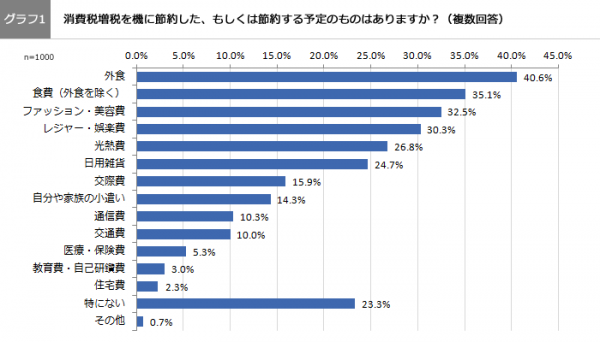 節約した、もしくは節約する予定のものが何か尋ねると、最多は「外食」40.6%、次いで2位「食費(外食除く)」35.1%、3位「ファッション・美容費」32.5%、4位「レジャー・娯楽費」30.3%、5位「光熱費」26.8%、6位「日用雑貨」24.7%、と続きました。