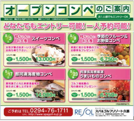 ゴルフ場やホテル・旅館の運営&運営受託や福利厚生サービス事業等を通してリゾートの再生・活性化を推進するリゾートソリューション株式会社(略称:リソル、東京都新宿区、多賀道正社長)が運営するゴルフ場のひとつ「スパ&ゴルフリゾート久慈」(茨城県常陸太田市)では、どなたでもエントリーできる(お1人様でもエントリー可能)オープンコンペをこの5月も多彩に(下記参照)開催予定しています。