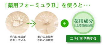 「薬用フォーミラB」を洗顔前につけて、軽くマッサージするようになじませると、酸化した皮脂が乳化し、溶かして落とすことができます。毛穴をきれいにするだけでなく、薬用成分による殺菌効果がニキビなどを予防します。