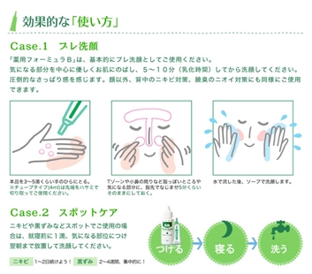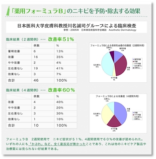 日本医科大学皮膚科教授川名誠司グループによる臨床検査(4週間例)の結果、「薬用フォーミラB」のニキビを予防・除去する効果改善率が60%という結果がでました。