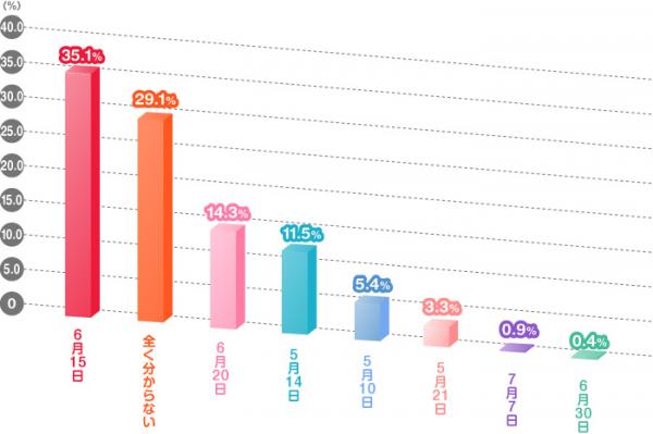 「今年の父の日がいつか分かりますか?」という質問をしたところ、約65%の人が分からない、もしくは誤った日を答えました。また「父の日」にプレゼントをあげますか?という質問にも、「基本的にはあげない」が約80%という、どちらもお父さんにとっては寂しい結果でした。一方、お父さんも「期待していない」「気にしていない」の回答がおよそ70%にのぼりました。