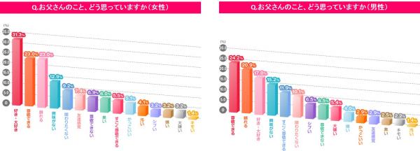 「父の日」を知らず、プレゼントもあげない子供たちですが、「お父さんのこと、どう思っていますか?」と聞いてみると、男女ともに「お父さん支持派」が1位でした!女性の気持ち1位はなんと、「好き・大好き」で、男性の気持ち1位も「尊敬できる」という、お父さんにとってはうれしい結果ですね。