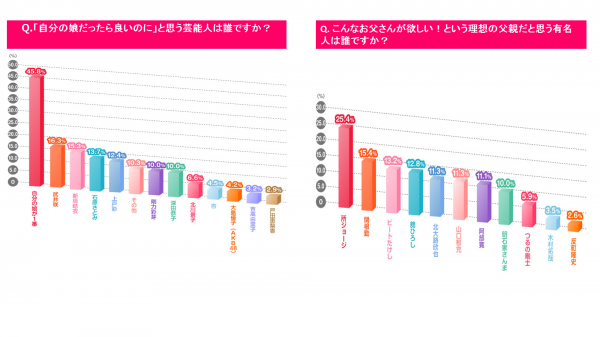 「自分の娘だったらいいのに、と思う芸能人はだれ?」という質問の1位は、CM女王の武井咲、2位は新垣結衣、3位が石原さとみでした。清潔感、明るさ、さわやかさ、やさしそう、というイメージが強い、人気タレントが上位をしめました。