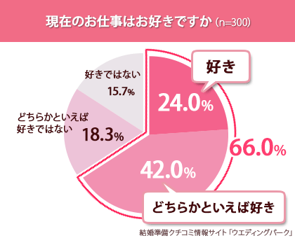 「好き(24.0%)」「どちらかといえば好き(42.0%)」と合わせて約7割が自分の仕事を好きだということがわかりました。