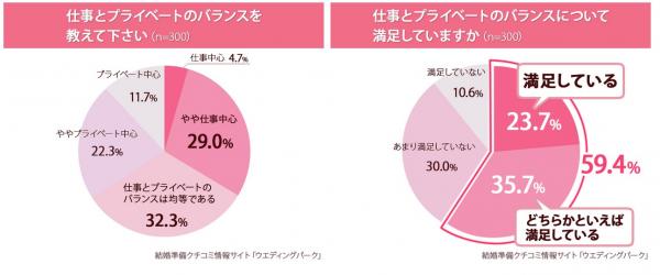 『あなたの仕事とプライベートのバランスをお答えください。(単一回答)』という質問に、「仕事中心(4.7%)」「やや仕事中心(29.0%)」と「仕事集中派」が33.7%、「仕事とプライベートのバランスは均等」の「バランス重視派」が32.3%、「ややプライベート中心(22.3%)」「プライベート中心(11.7%)」と「プライベート充実派」が34.0%とそれぞれほぼ均等な割合に。また『仕事とプライベートのバランスについて満足していますか(単一回答)』という質問には「満足している(23.7%)」「どちらかといえば満足している(35.7%)」と合わせて59.4%と約6割が現状に満足していることがわかりました。