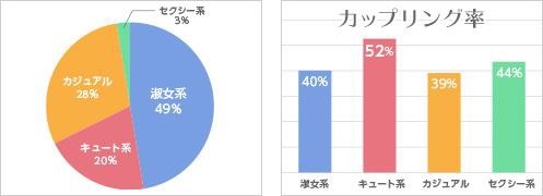 月間動員数15,000人突破した婚活パーティー「PARTY☆PARTY」が、パーティーに参加した女性313名の服装を調査してみたところ、淑女系ファッションが49%と最多であったことが分かりました。一方、カップリング率を調べると、ワンピースなどのキュート系ファッションが52%と一番多いことが分かりました。