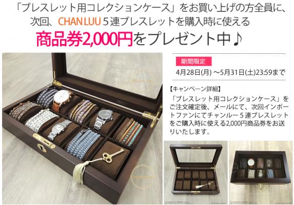 引き出しの中で、バラバラになりがちなブレスレットを、ホコリ知らでおしゃれに収納できる「ブレスレット用コレクションケース」をお買い上げの方全員に、次回インポートファンでチャンルー5連ブレスレットを購入時に使える商品券2,000円分をプレゼントするキャンペーンを、4月28日(月)~5月31日(土)23:59までの期間限定で行います。
